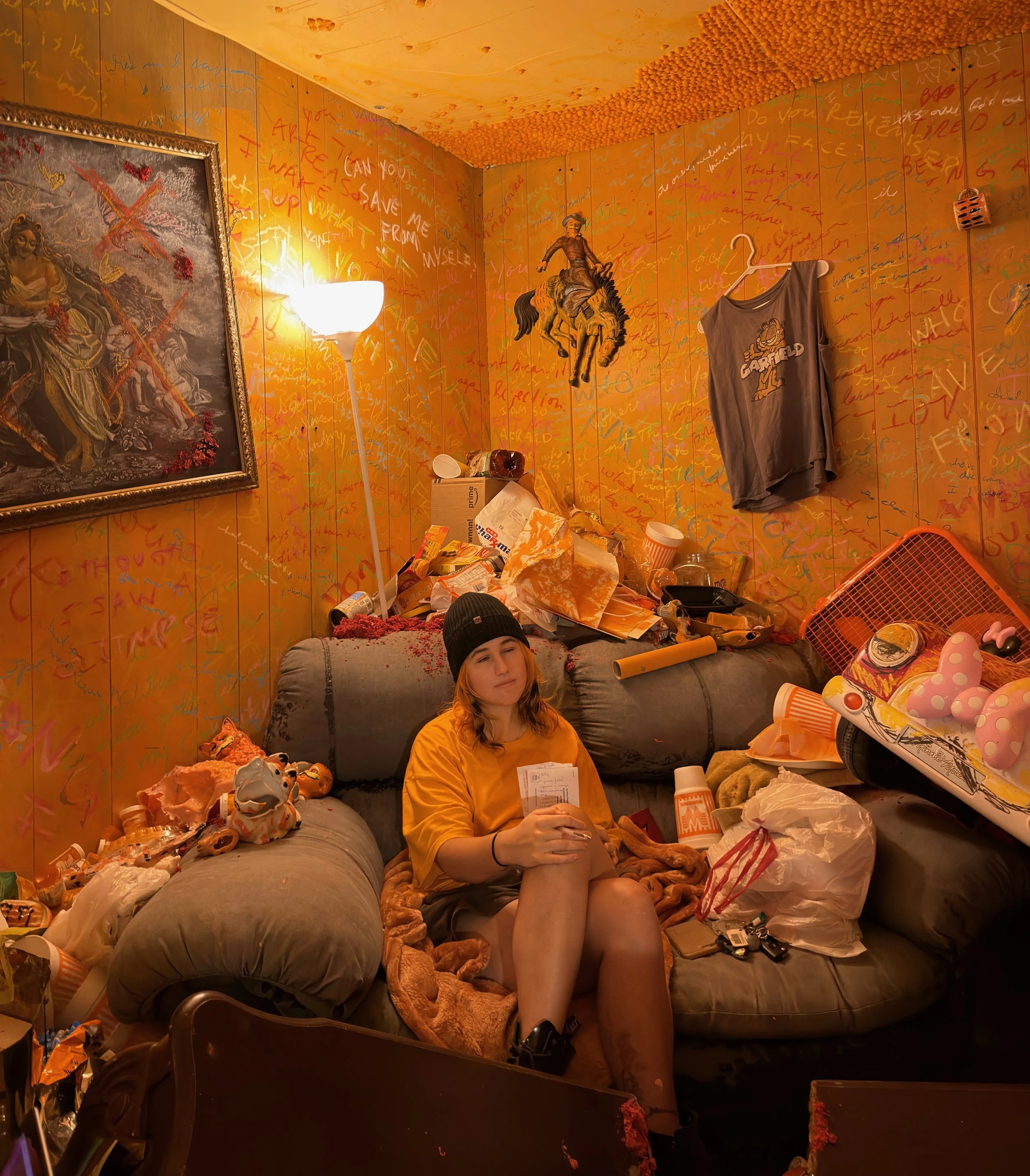 Born in Lafayette, Louisiana, Kat Perkins is an artist with concentrations in printmaking, ready-mades, and ceramic sculpture. After primarily working with traditional animal narratives in her earlier works, she is now primarily focused on aspects of depravity, hedonism, and consumerism. Working with themes of nihilism and chaos (technically and conceptually), she embraces the person she is tempted to be, and in doing so, challenges how we find purpose while representing an uncomfortably familiar instability in a broken world. Kat shows the extents of isolation by studying Garfiel-delusion: a She received her BFA from the University of Louisiana at Lafayette in 2021, her MFA at Texas A&M University- Corpus Christi, and is currently teaching and working as a shop technician while continuing to create in the Corpus Christi art scene.